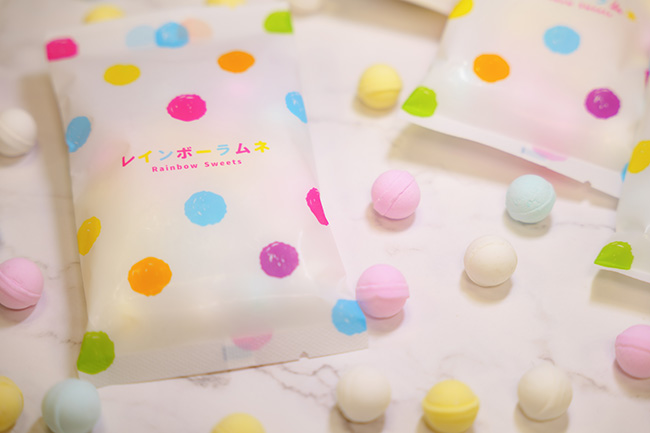 レインボーラムネは、直径1〜1.2センチが主流とされるラムネ業界では異例の直径2センチを誇るカラフルな大玉ラムネです。