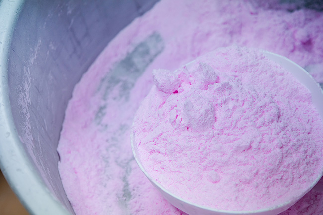 ラムネの味を左右する素材は、とことんシンプルに。厳選した北海道産のビートグラニュー糖やコーンスターチ、香料を独自の配合でブレンドしていきます。