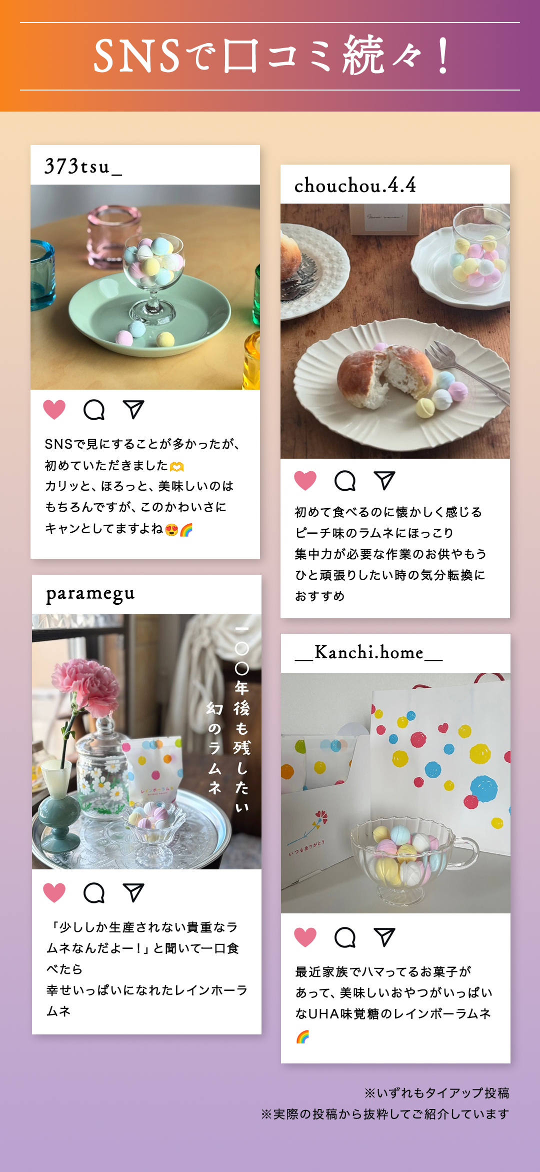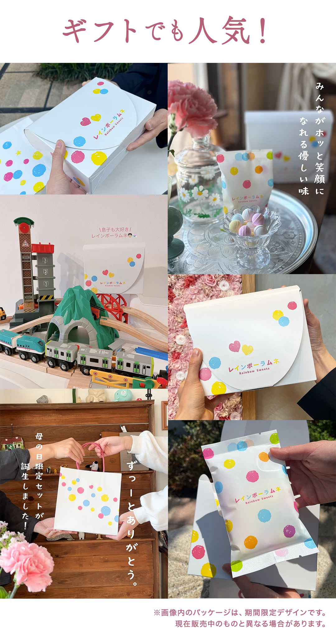 カリッホロッとした口溶けの良さに加え、やさしい甘さの虜になる幻のレインボーラムネは、製造数の兼ね合いからお届けできる量はごくわずか。今もなお、たくさんの皆様にお待ちいただいています。