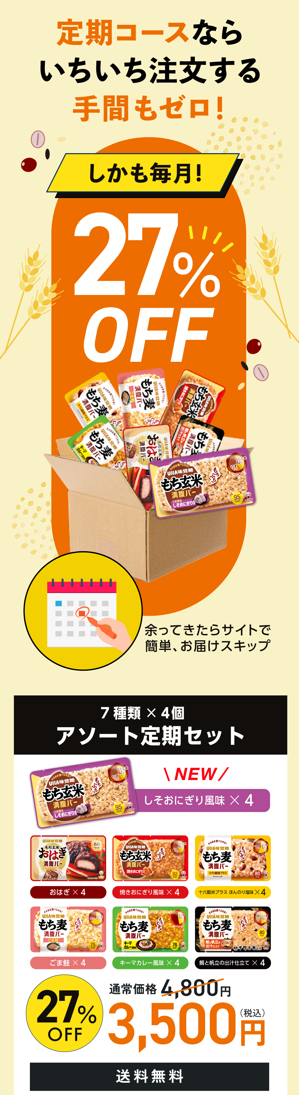 もち麦(もち大麦(国産))、雑穀ミックス(大麦、黒米、大豆、発芽玄米、とうもろこし、ひえ、あわ、きび、発芽赤米、アマランサス、キヌア、たかきび、はと麦、白ごま、黒ごま)、小豆、オリゴ糖、植物油脂、食塩、食物繊維、こんにゃく粉、昆布エキス、(一部にごま・大豆を含む)