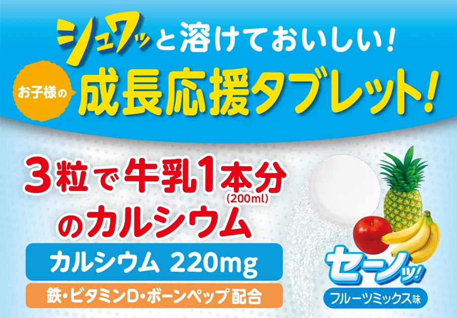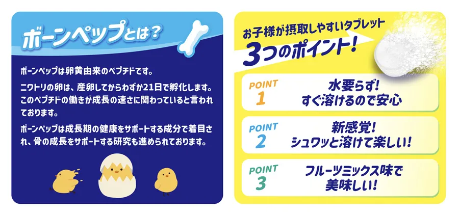 さらに注目成分ボーンペップや、鉄・ビタミンDも一度に補給することができます。牛乳が苦手なお子様や、栄養の偏りが気になる方におすすめです。