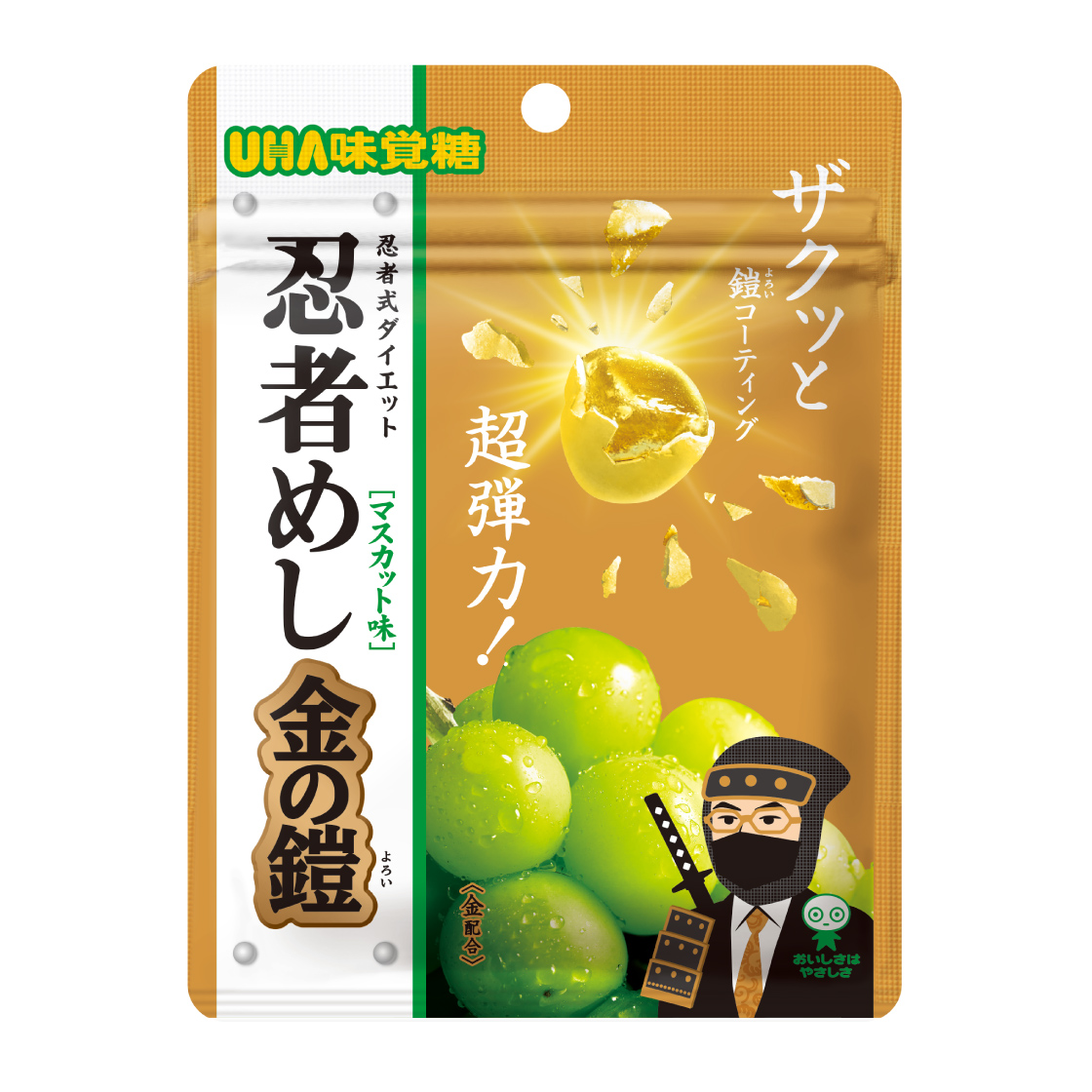 金箔シュガーをコーティングした弾力食感グミが登場!! ザクザクコーティングと超弾力ハードグミの組み合わせがクセになる噛み応えでござるヨ。
