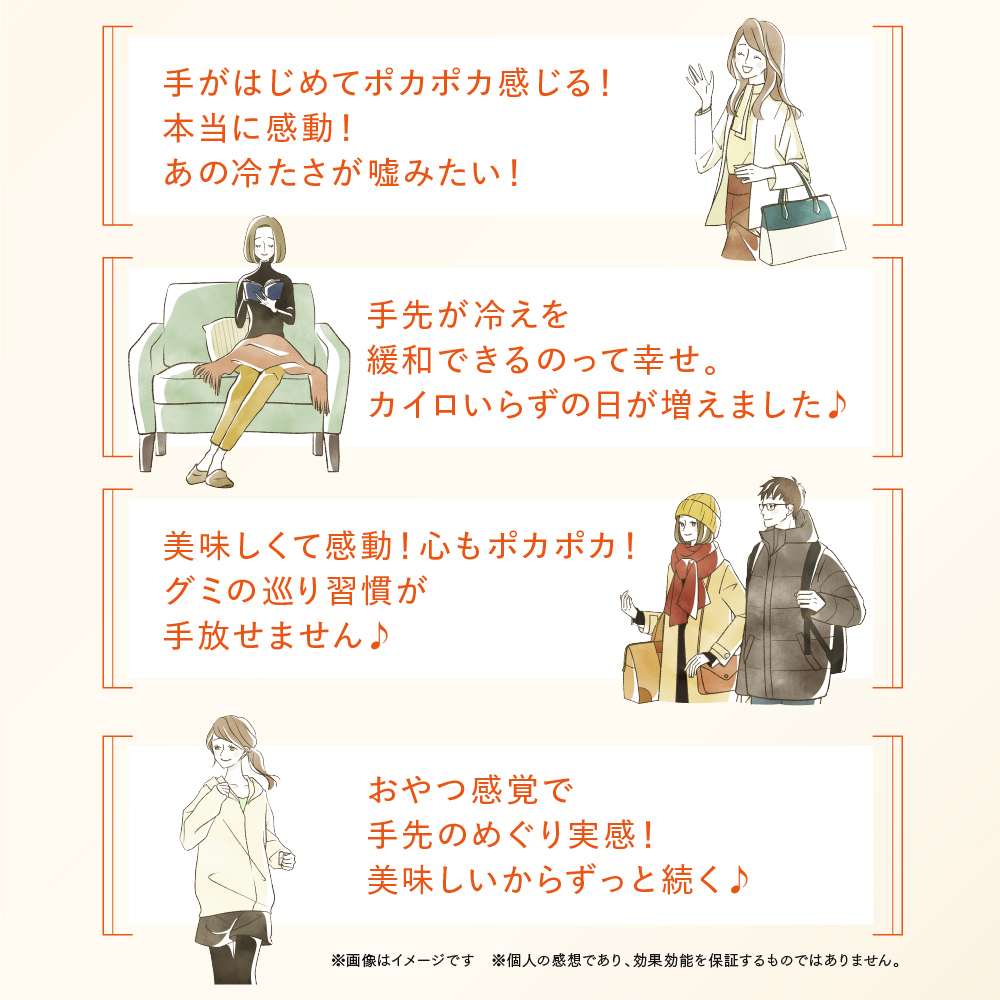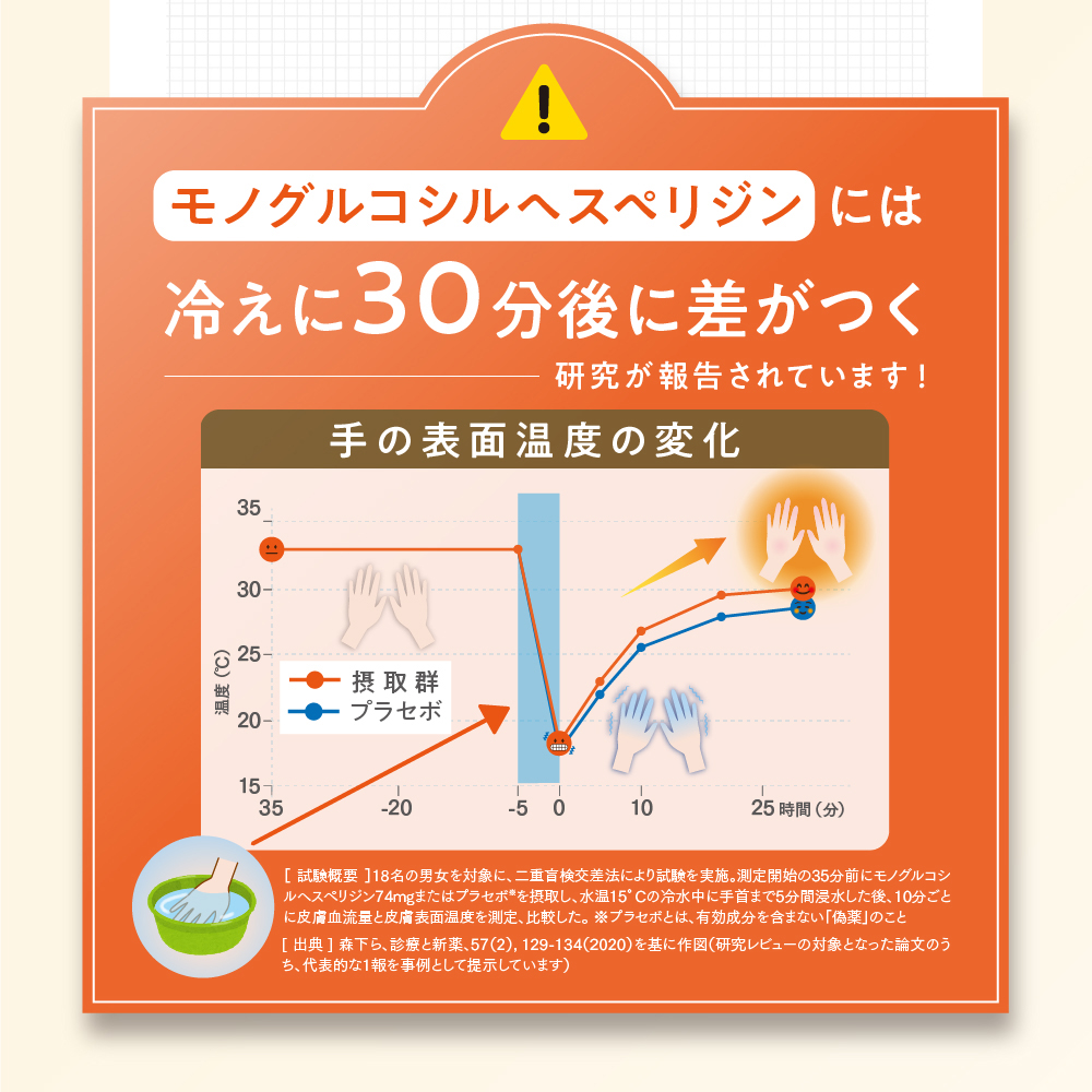本品にはモノグルコシルヘスペリジンが含まれます。モノグルコシルヘスペリジンには、冷えにより低下した血流(末梢血流)を改善し、体温(末梢体温)を保つ機能があることが報告されています。