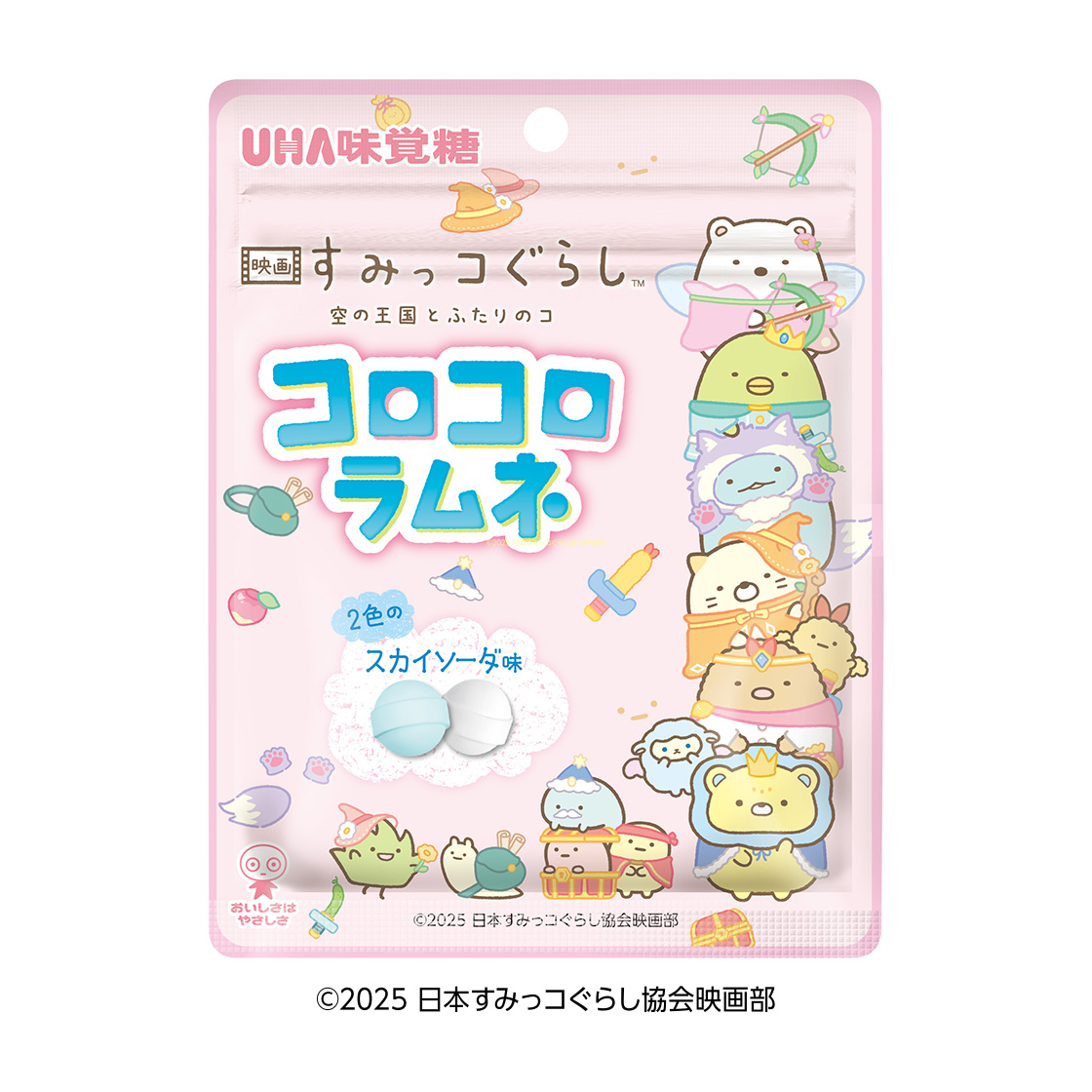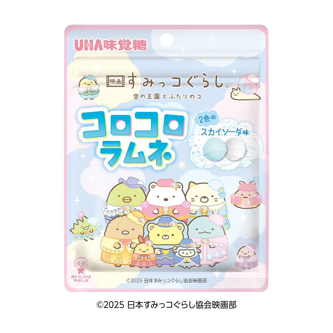 さわやかで甘酸っぱい味わいが特徴です。白と青色の2色ミックスにし、映画の世界観と合わせて「スカイソーダ味」と名づけました。