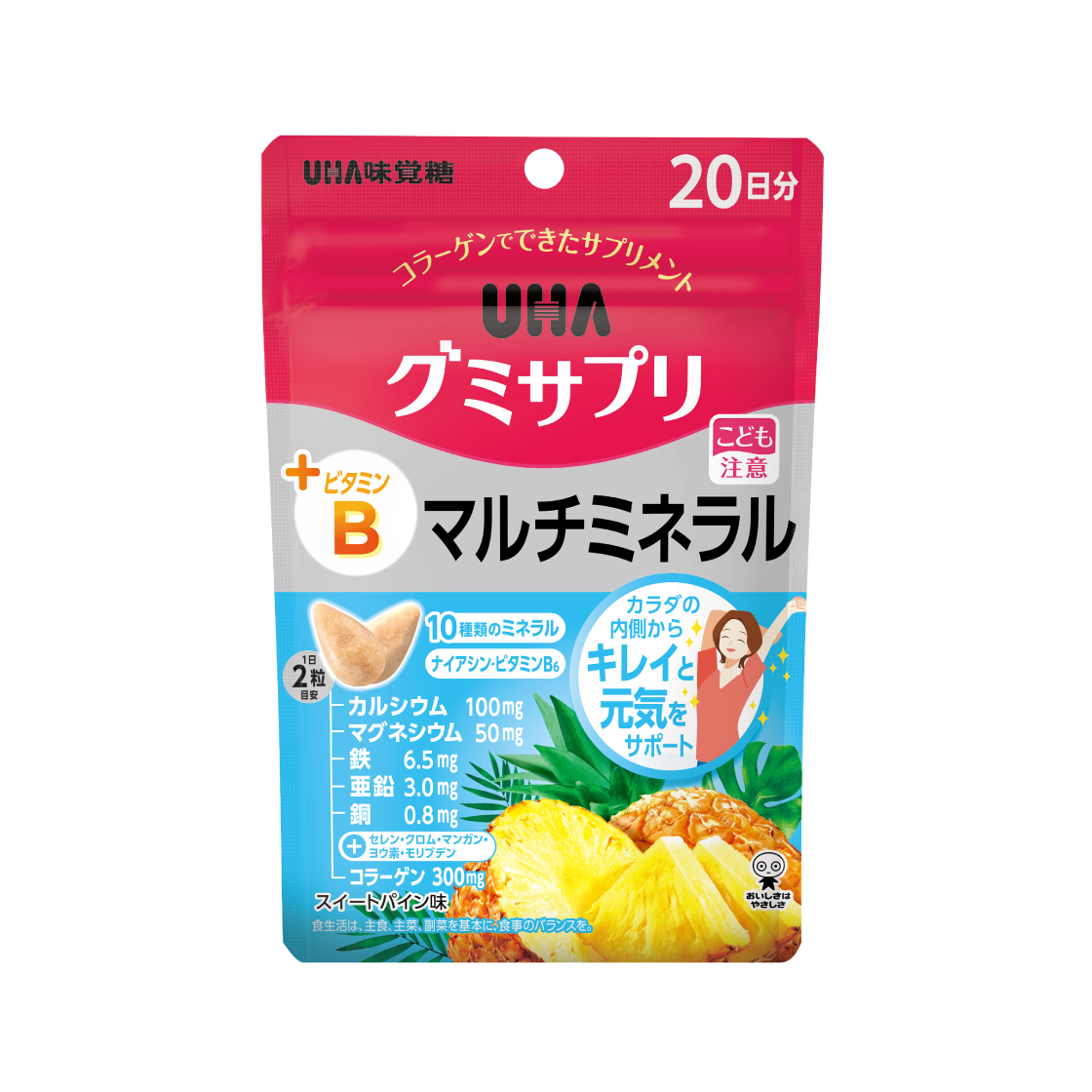 砂糖(国内製造)、水飴、コラーゲン、濃縮果汁(りんご、パインアップル)、ぶどう糖、澱粉、マンガン含有酵母末、亜鉛含有酵母末、銅含有酵母末、モリブデン含有酵母末、ヨウ素含有酵母末、セレン含有酵母末、クロム含有酵母末/甘味料(ソルビトール、ステビア)、リン酸マグネシウム、貝カルシウム、香料、ゲル化剤(増粘多糖類)、ピロリン酸第二鉄、グルコン酸銅、V.B6、(一部に大豆・りんご・ゼラチンを含む)